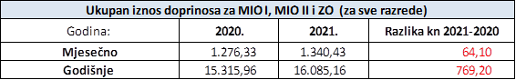 Smanjenje porezne obveze prati povećanje drugih obveza, i to iznosa doprinosa za mirovinsko i zdravstveno osiguranje. Usporedba iznosa doprinosa za obvezna osiguranja za prošlu i ovu godinu izgleda ovako: