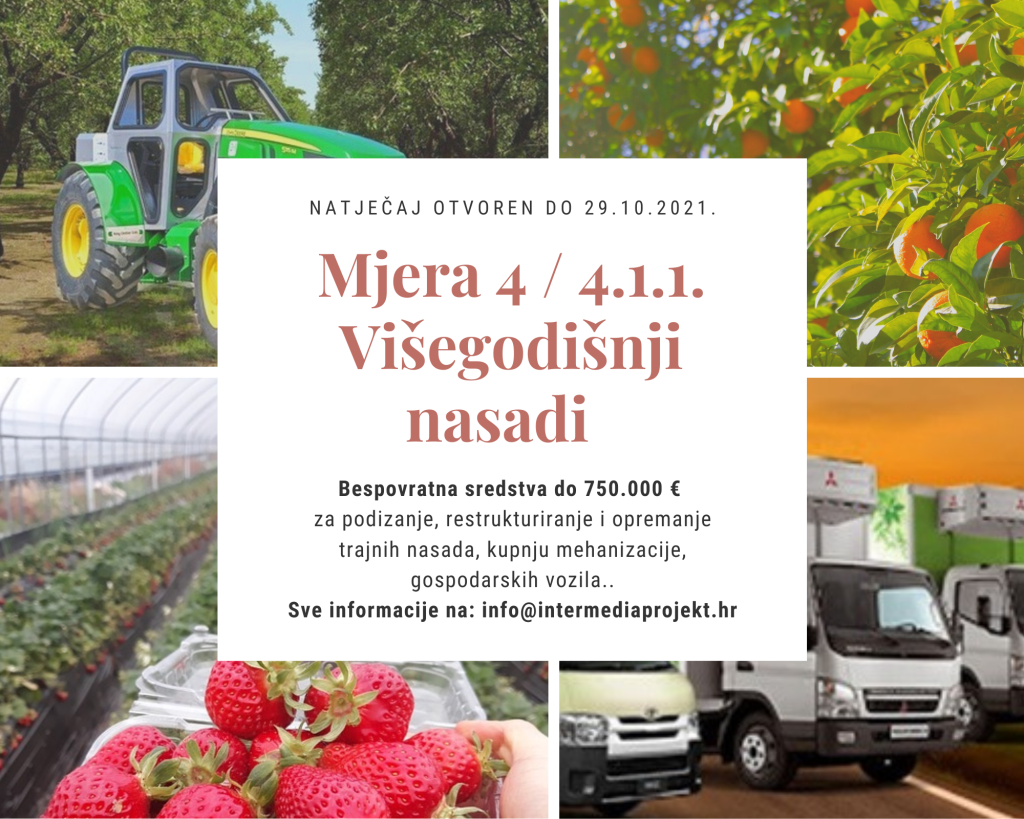 Više detalja o oba natječaja možete pronaći i na poveznicama: Mjera 4.1.1. Višegodišnji nasadi i Mjera 4.1.1. Vinogradi stolnih sorti.