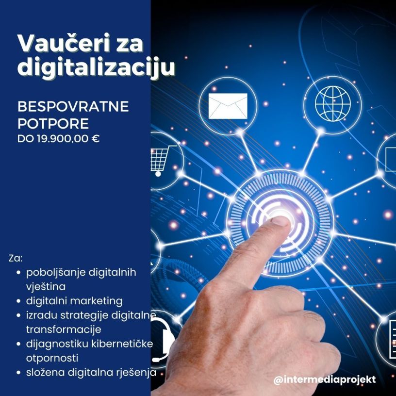 Objavljen je natječaj – poziv na dostavu projektnih prijedloga Vaučeri za digitalizaciju. Vaučeri – bespovratne potpore dodjeljuju se poduzetnicima i obrtnicima za izradu web stranica, mobilnih aplikacija, vođenje društvenih mreža, ali i složena digitalna rješenja i druga ulaganja u digitalizaciju.
