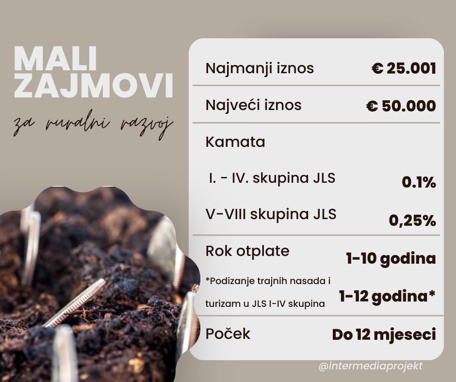 Ukoliko ste zainteresirani za korištenje malih zajmova za ruralni razvoj stojimo Vam na raspolaganju za više informacija i izradu poslovnog plana i ostale prijavne dokumentacije.