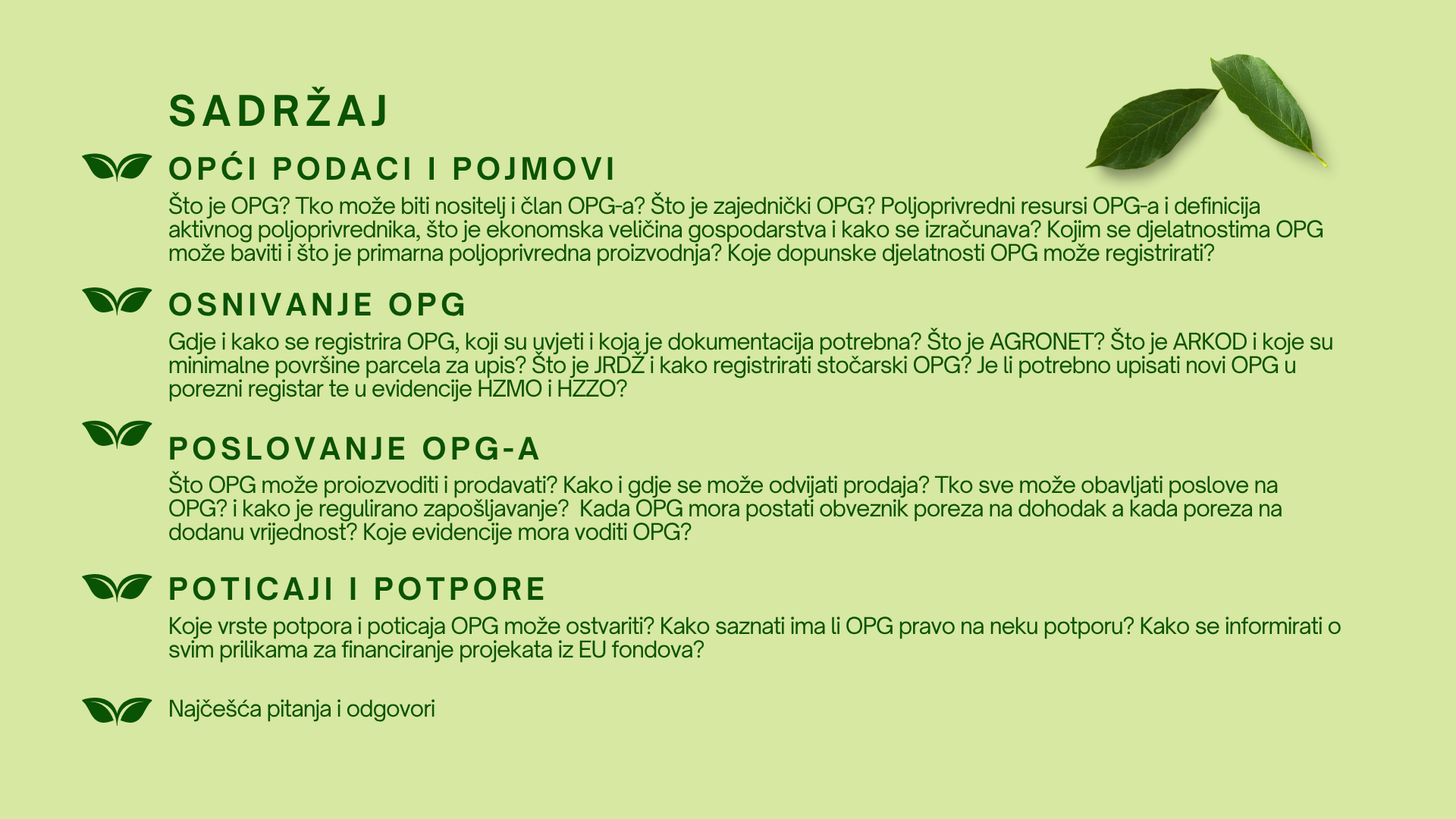- Opće informacije: Što je OPG? Tko može biti nositelj i član OPG-a? Što je zajednički OPG? Poljoprivredni resursi OPG-a i definicija aktivnog poljoprivrednika, što je ekonomska veličina gospodarstva i kako se izračunava? Kojim se djelatnostima OPG može baviti i što je primarna poljoprivredna proizvodnja? Koje dopunske djelatnosti OPG može registrirati?